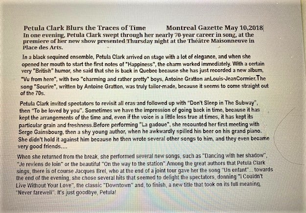 Another indication of that importance occurred in 2000 when Petula began what she dubbed her “One Woman Show “in Montreal. The Globe and Mail reporter Martin Siberok reported on it :
