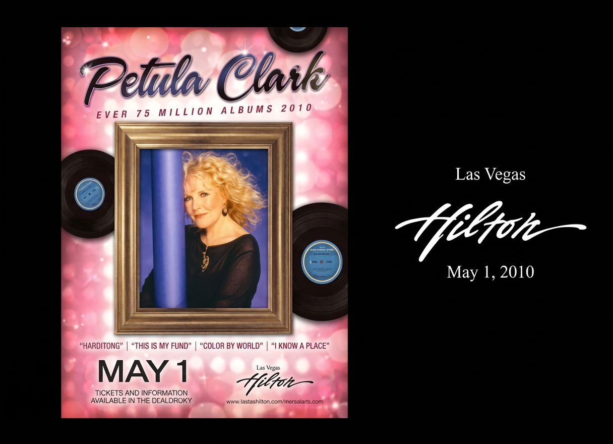 Petula’s next Vegas appearance was in a proper theatre –quite a famous one, actually –the Las Vegas Hilton showroom, on May 1, 2010. The Hilton is a bit off the Strip but connected by the Las Vegas monorail system which as Vegas expanded became a welcome link to the major hotels .This concert was given lots of publicity and where the other venues mentioned in this post were mostly visited by local patrons , the Hilton had an iconic Vegas reputation and I am sure the theatre was filled with people like us, from near and far, happy to be seeing Petula perform at a major Vegas venue, even if it wasn’t the seventies!!